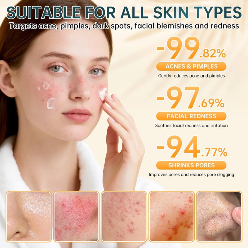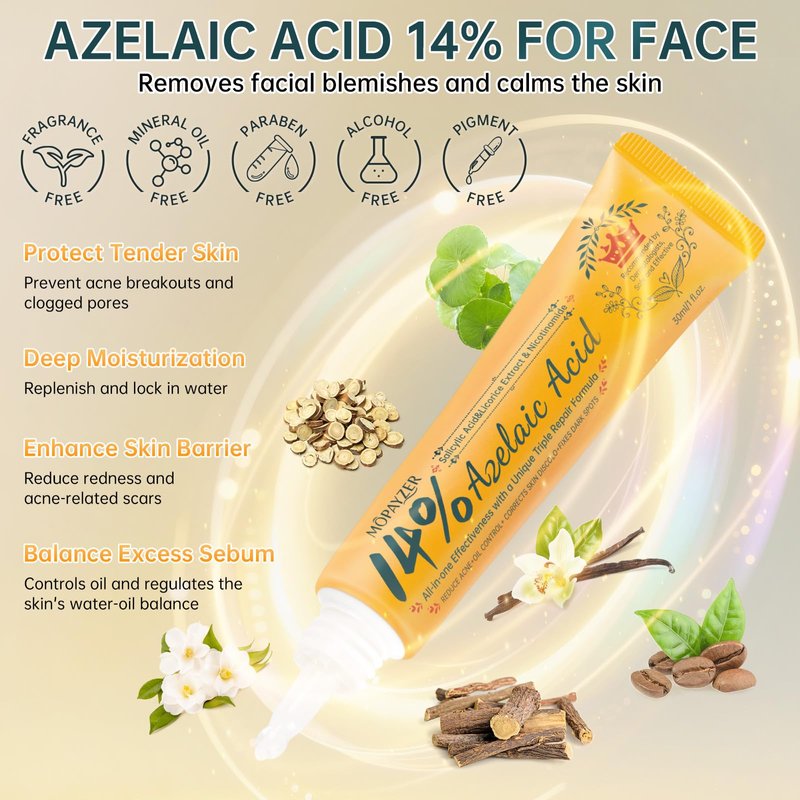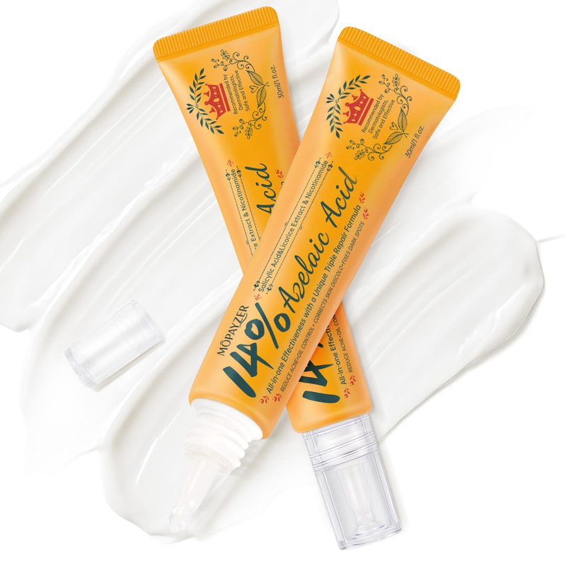 Azelaic acid 14% cream balances facial oil and water, improves pore size and prevents pore clogging, and its gentle texture is easy to apply and absorb, making it ideal for daily skincare and travel.