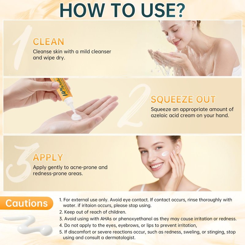 The gentle and delicate formula of Azelaic Acid Cream reduces facial blemishes, acne and dark spots, soothes redness and calms the skin. Helps improve skin texture and deeply moisturizes skin.