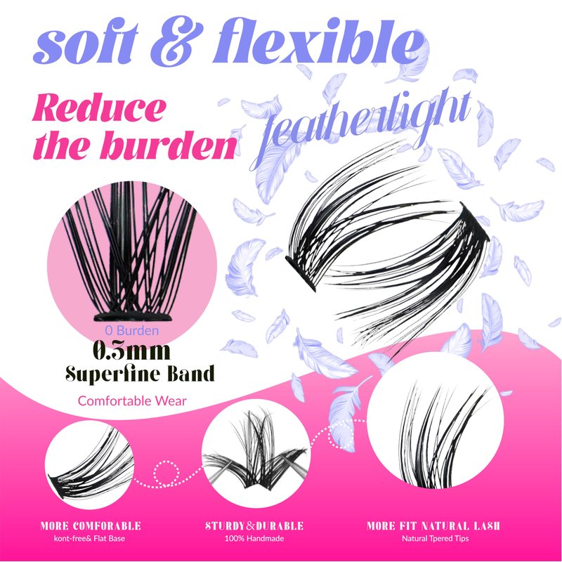 - cluster lashes are made of premium PBT silk fiber, which is light and soft without knots. These volume and DIY cluster extension, Perfect with a full face of makeup or just by themselves. Easy to pick up and comfortable to wear. Super cute and easy to apply.