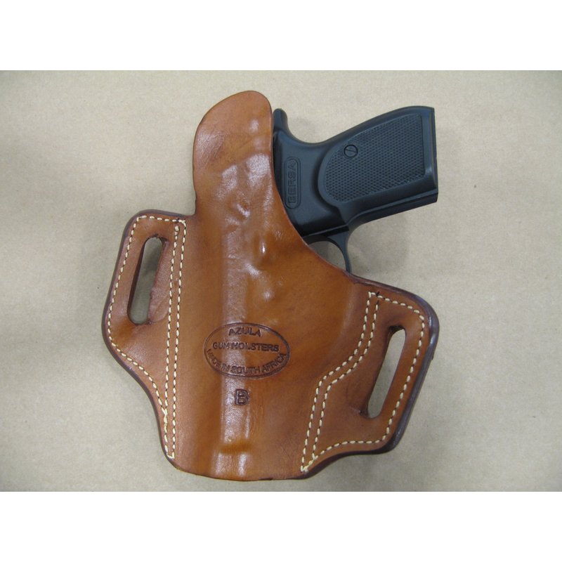 AZULA Gun Holsters Two Slot Pancake Gun Holsters are a custom leather Outside the Waist Band OWB holster for Beretta 84 / 85 .380 Pistols. Hand crafted from top quality leather to last a lifetime. The Azula Two slot pancake holster is designed to be worn with a belt up to 1.5" in width. The back of the holster covers the top of the pistol slide with a full COMFORT SHIELD so it does not dig into you for additional comfort that is not found in many other holsters. A Reinforced tab on the front of the holster offers additional support that stops the leather from rolling over with use. Azula Two slot pancake holsters are a full length holster that covers the pistol completely so your front sight does not hang down below the holster. Azula Gun Holsters are hand made by master craftsman with over 30 years of holster making experience. Azula Gun Holsters have a lifetime replacement warranty and our Azula Leather gun belts match the OWB Two slot pancake holster. We offer the Azula leather belts up to size 58 to match your two slot pancake holster. This is a RIGHT HANDED TAN leather holster.