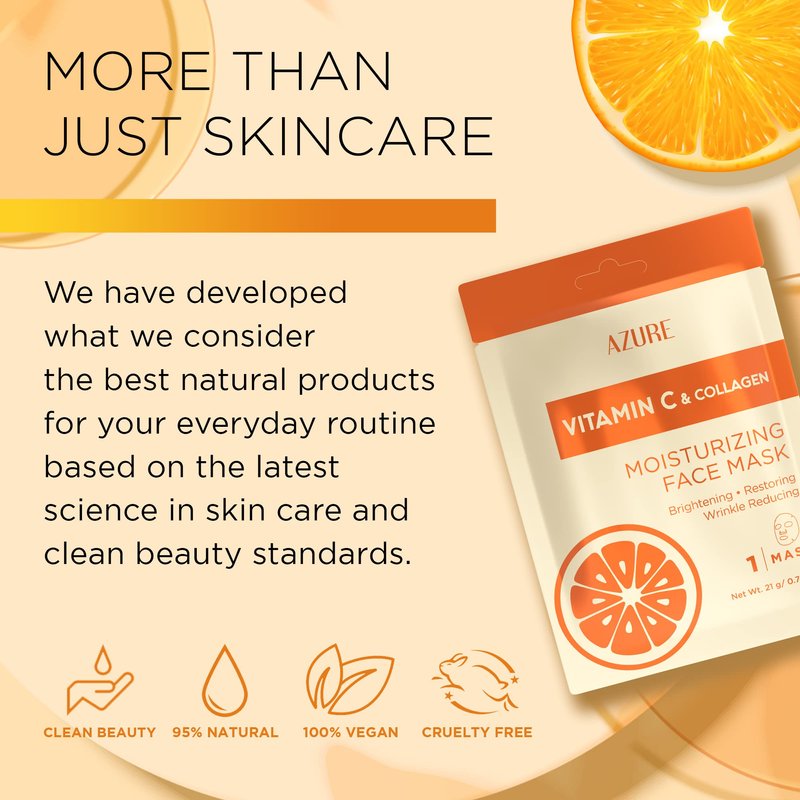 - BRIGHTENS AND TONES SKIN: Our Vitamin C and Collagen moisturizing face mask is specially formulated to improve uneven skin tone and firmness, restoring the vitality of your skin. Our sheet masks help diminish the appearance of fine lines and wrinkles for more youthful, revitalized, and radiant skin.