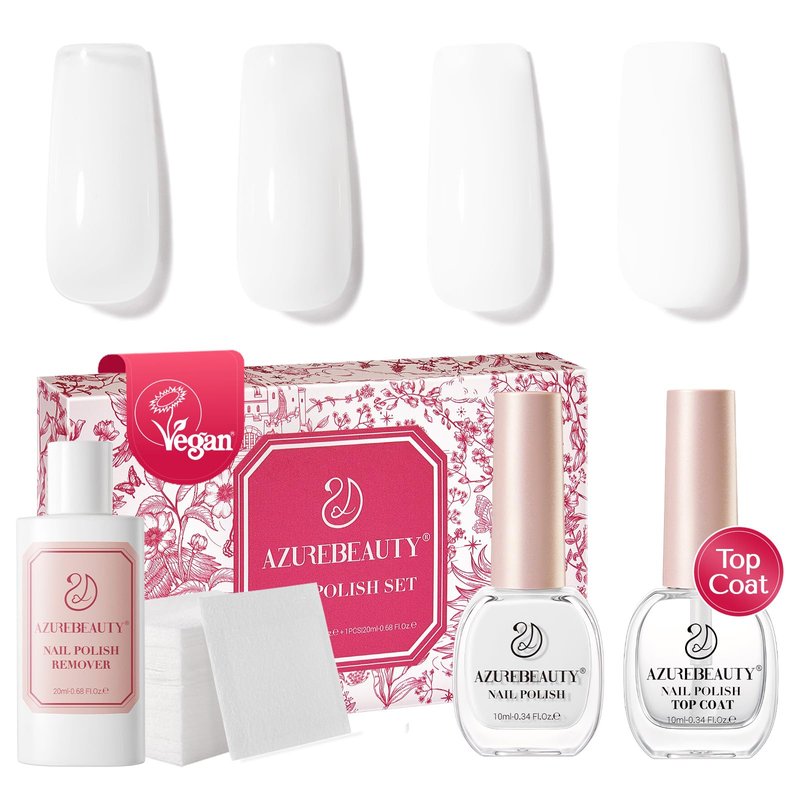 AZUREBEAUTY 2024 New Nail Polish Set: 1* Clear milk white nail polish, 1* Top coat, 1*20ml nail polish remover, and 50* nail polish remover pads. This complete one-stop nail polish experience comes in an exquisite packaging gift box, making it the perfect choice for female friends.