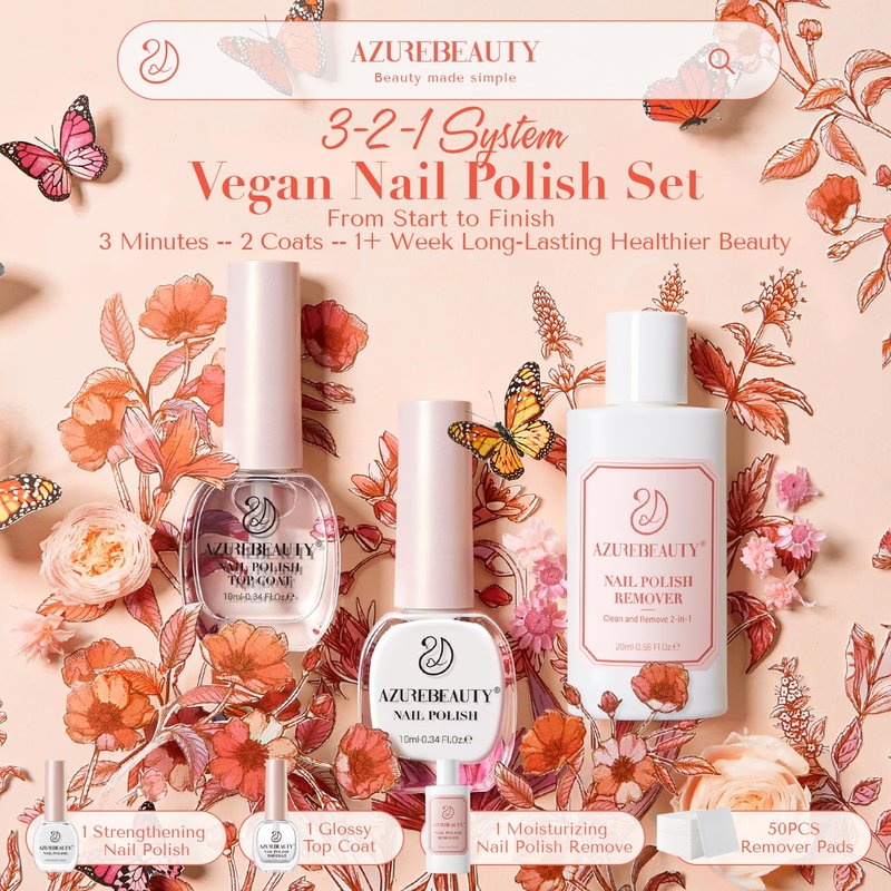 AZUREBEAUTY Vegan Nail Polish Set, Milk White Clear Quick Dry Complete Starter Natural Nail Lacquer Strengthening Treatment Kit with Top Coat & Nail Polish Remover, 50Pcs Nail Remover Cotton Pad