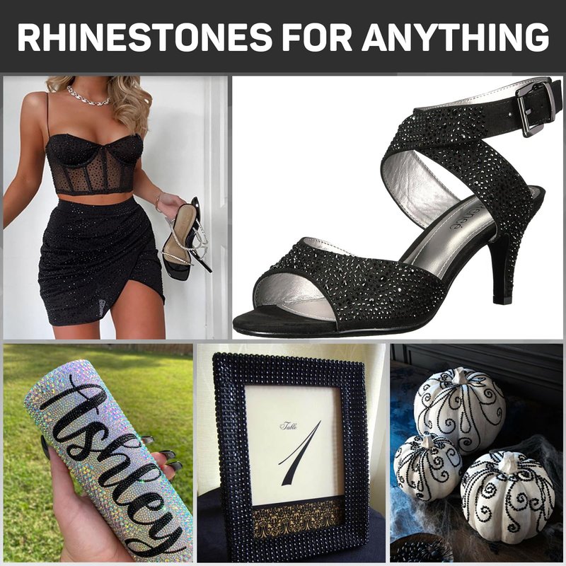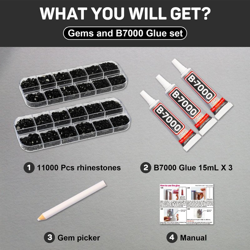 The crystals and diamonds Black rhinestones flatback with B7000 gem glue kit comes with assorted sizes of resin gems for crafts, 11000pcs rhinestones, perfect for bling out and decorating craft and fabric projects, such as clothes, clothing, tumblers, DIY Graduation Cap, phone cases, nails art, sneakers, shoes, gel pen, earring jewelry marking, bows, charms and more, adding creative and charm to your various decorations.