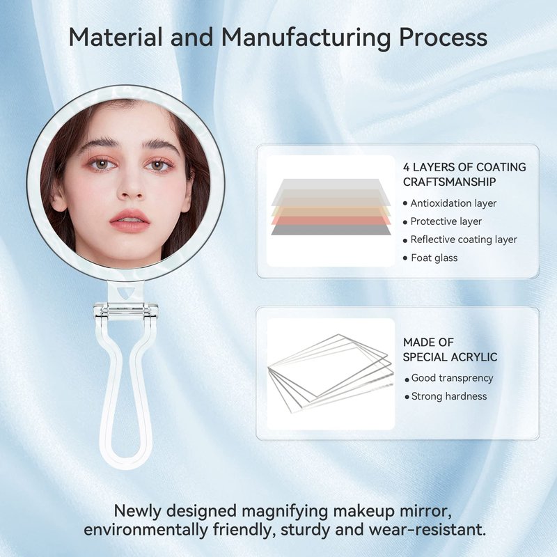 - 💗Handheld Magnifying Mirrors: This set includes a 5-inch double-sided handheld magnifying mirror. Its front side has a standard 1x magnification, while its back boasts a 30x magnification. The set comes with a storage bag and a box, perfect for carrying around when traveling, or you can send it out as a gift to a loved one. The mirrors are versatile. You can easily use the handheld mirror due to its ergonomic and smart design -- stand it on a table or hang it on a wall.