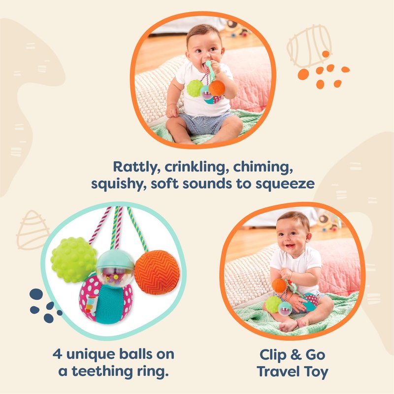 B. toys- B. baby- Sensory Baby Rattle – Baby Toy – 4 Balls & Clip – Colors, Textures & Sounds – Sounds So Squeezy- 3 Months +