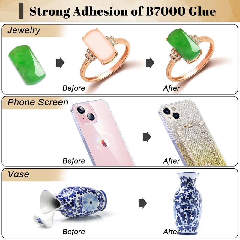 - ✅Suitable for Craft Projects & Detail Works ✅Went on smooth, easy clean up, clog free tip, B-7000 super glue fits most of material like wood, glass, fabric, ceramic, gems, metal, stone, plastics, rubber, silicone and acrylic. They usually use for replacing/ adhere cell phone screen /backs, repairing broken glasses, glue in 3d printed resin minis key places and some detail works, also used for rhinestone gems crystal stones gel on bags, nails, clothes, toys and any other DIY Crafts projects.