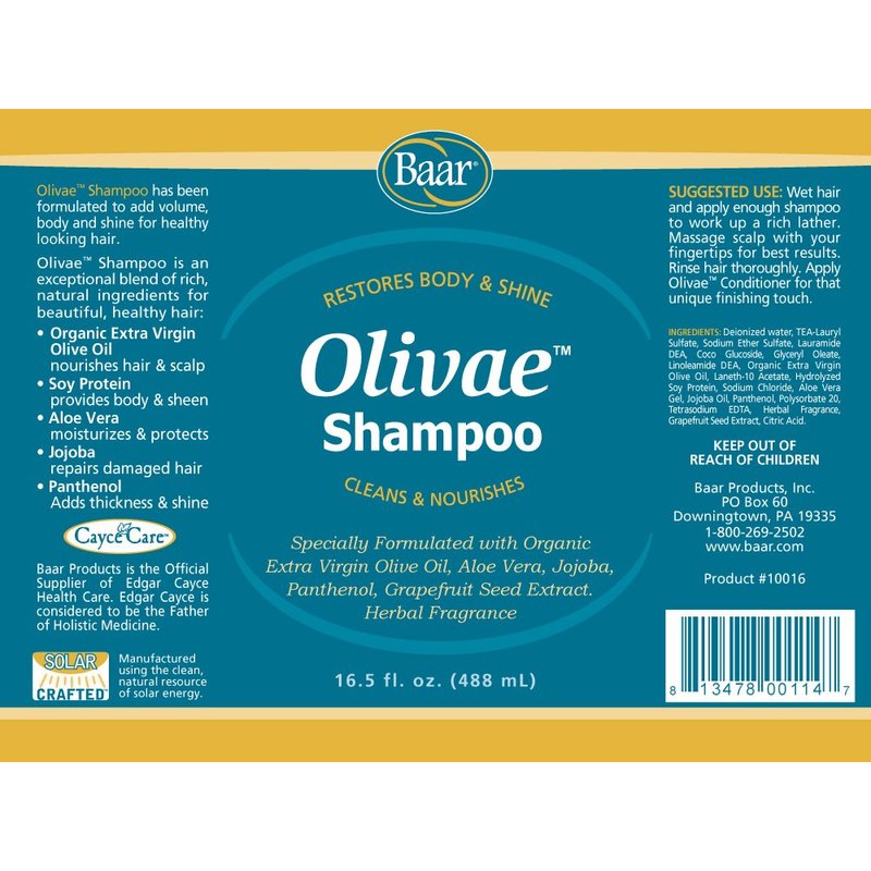 Baar Olivae Shampoo, 16.5 Fl Oz - Organic Olive Oil Formula Nourishes Hair While Cleaning. Aloe Vera, Jojoba Oil, and Proteins Repair Damaged Hair and Adds Body to All Hair Types
