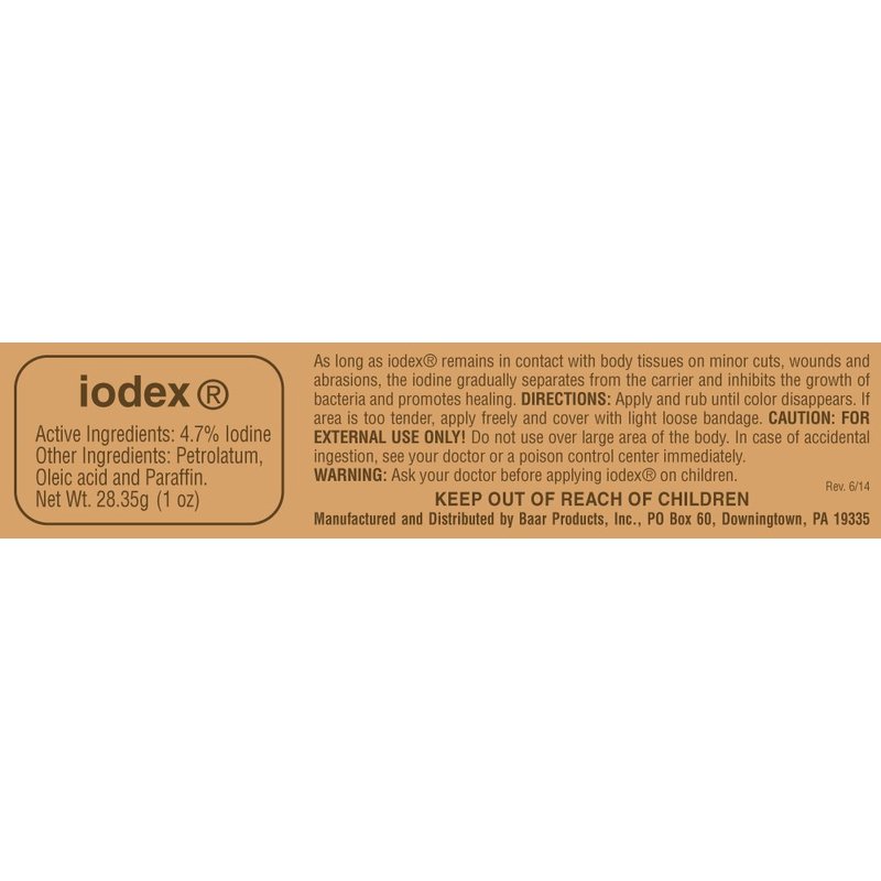 - POWERFUL IODINE - Iodex is made with 4.7% iodine, which gradually separates from the molecule of the carrier in order to inhibit the growth and action of bacteria and promote healing.