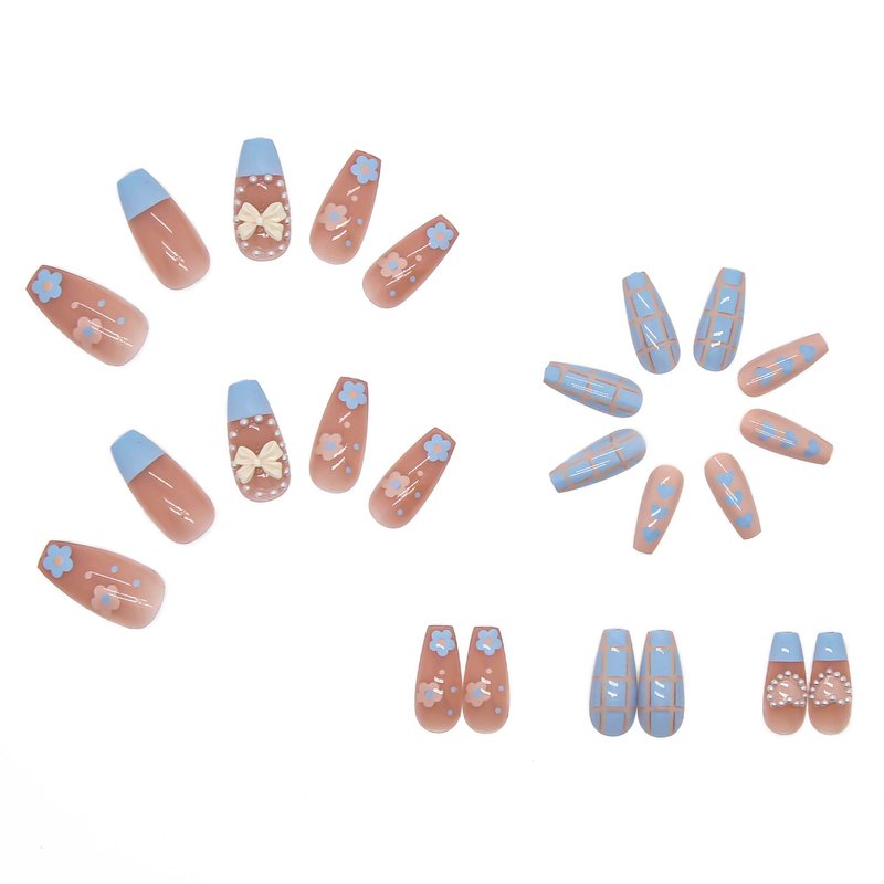 - UNIQUE DESIGN - Blue flower and bow design press on nails, pink heart valentins nails fake nails long coffin shape, combine trendy elements with classic color and shape, looks shiny and cute