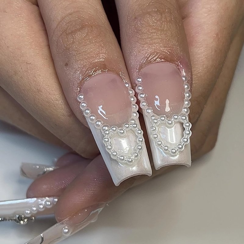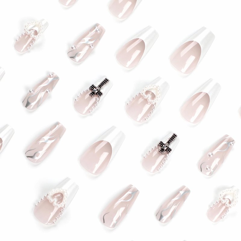 BABALAL Coffin Press on Nails Long Fake Nails White French Glue on Nails 3d Cross Pearl Heart Acrylic Nails 24Pcs Ballerina Y2k Manicure Artificial False Nails for Women and Girls