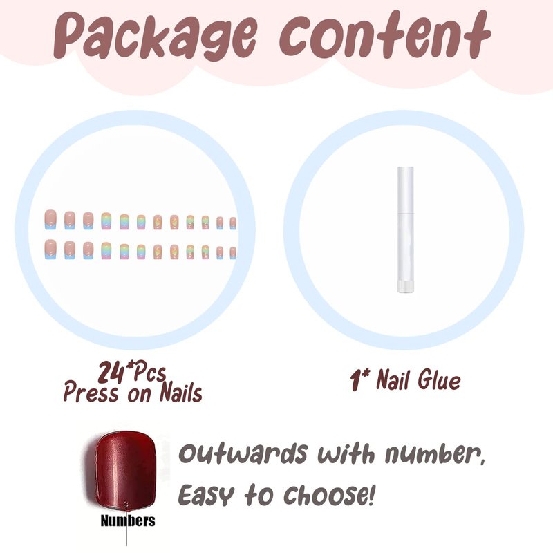 - 【Package Includes】One boxes of square press on nails medium(24 pcs) in one pack, divided into different sizes, you will definitely find a fake nail that fits your nail size. 1 nail glue included with the package. No need to buy other things, you can get the nail salon-like effect
