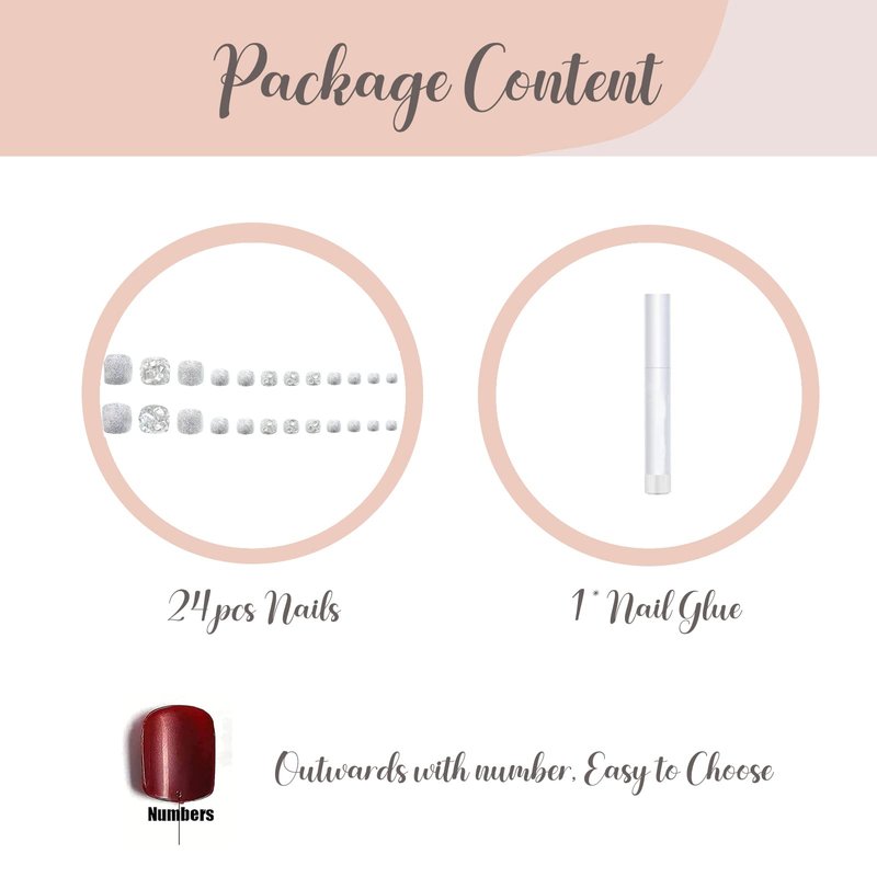 - 【Multiple Application】These special fake toenails designs can make you stand out at parties, dates, weddings, proms, and Christmas. Wear these fake toe nails, go on holiday with friends take a walk on the beach in summer. Cute nails are also easily with any collocation of sandals, heels, and flip flops.It can be given as a gift to your wife, mother, girlfriend, daughter or friends. It will bring them a comfortable and convenient manicure art experience.