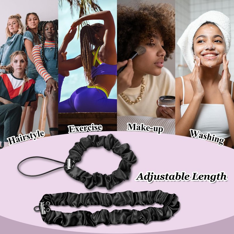 - 【Versatile and Stylish】 The classic black satin adjustable hair scrunchie is perfect for everyone. These women's hair accessories will effortlessly complement any outfit and are definitely a must-have for workouts. Remember, it is excellent for keeping your hair neat while washing or applying makeup. Its unique design with textured satin and a metal cord lock also doubles as a stylish wristband.