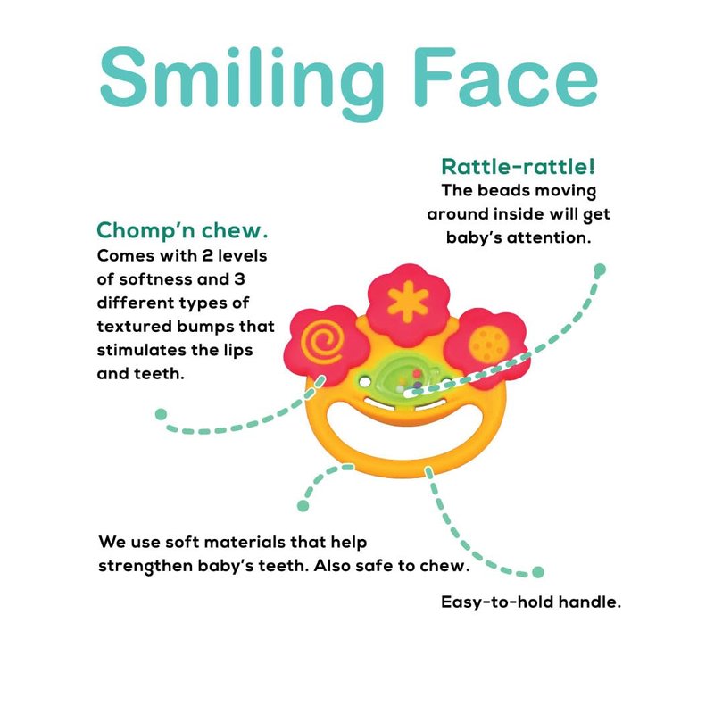 - 𦷠TEETHING RELIEF: Soothe your little oneās gums with multiple sensory points and textures. The Smiling Face is a safe and fun way to reduce fussiness and discomfort.