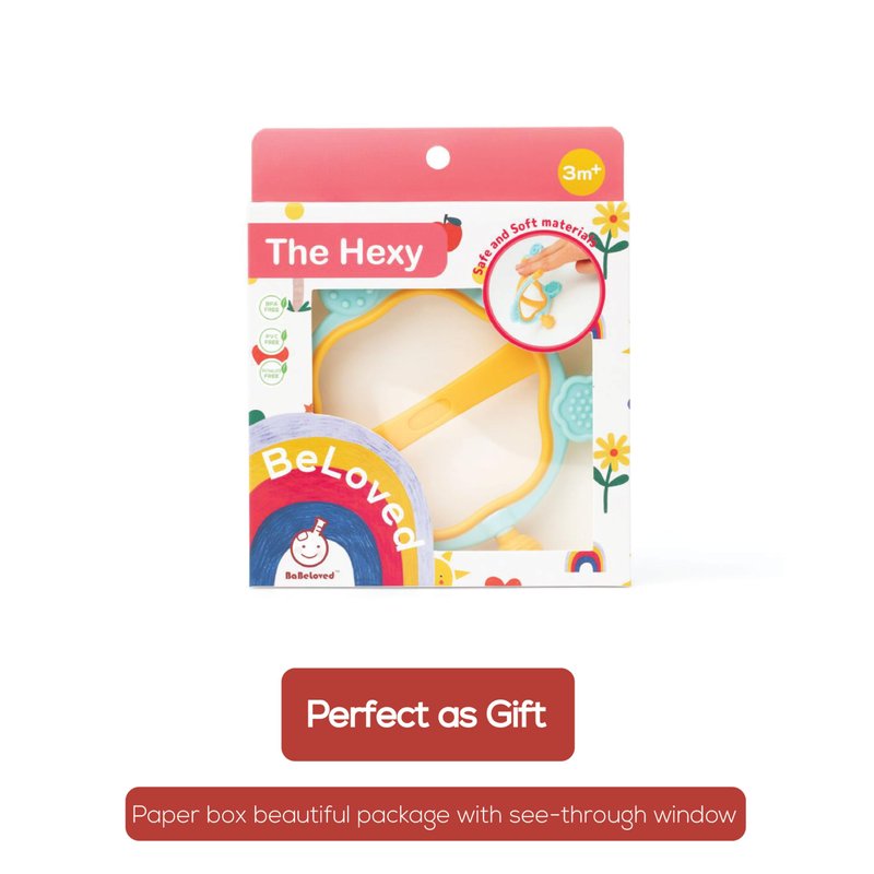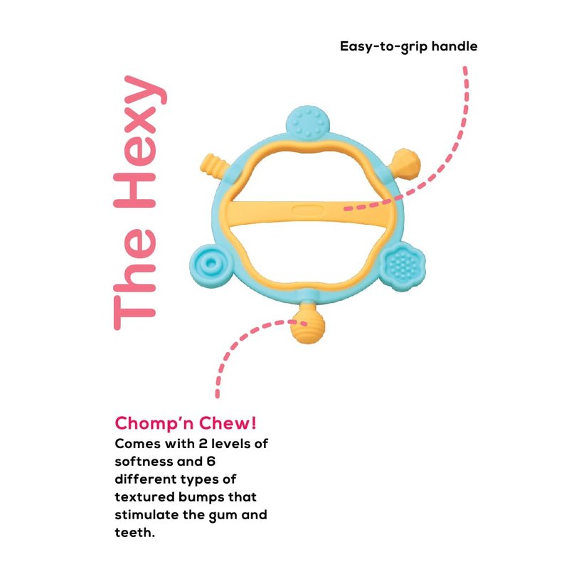- 𦷠TEETHING RELIEF: Soothe your little oneās gums with multiple sensory points and textures. The Hexy is a safe and fun way to reduce fussiness and discomfort.