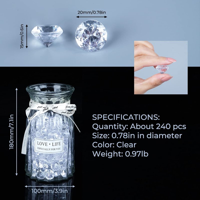 - Package Includes: There are 240 pieces of acrylic diamonds approximately 3/4 inch (20 millimeters) in diameter. Perfect for filling up a vase or scattering a few around some candles. please note these are faux diamonds and not real diamonds