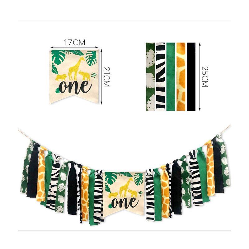 - HIGH QUALITY BURLAP BANNER - The banner features a lion, giraffe, and elephant in gold with vibrant green, also animals patterns fabrics to match. All objects on twine can be moved to make the banner longer or shorter as needed, wherever you put will definitely light up your party