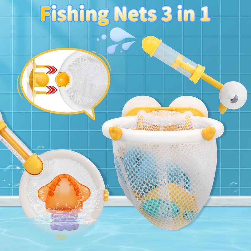 - 【Multifunctional Fishing Net】 The fishing net can be disassembled into two parts, one part is used as a suction cup net bag to store bath toys, and the other part can be used as a water gun. When combined together, it becomes a fishing tool, bringing various interesting bathing experiences and helping to cultivate hand-eye coordination.
