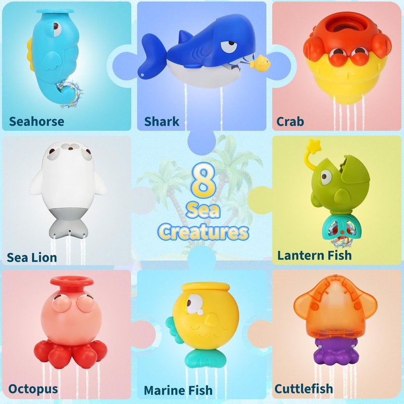 - 【Interesting Marine Animals】 Pull the shark bait and put it in the bathtub, and the shark will swim in the water. 8 different marine animals have various interesting small functions to stimulate children's interest. The bright colors can attract the baby's attention and make children's bath time full of fun.