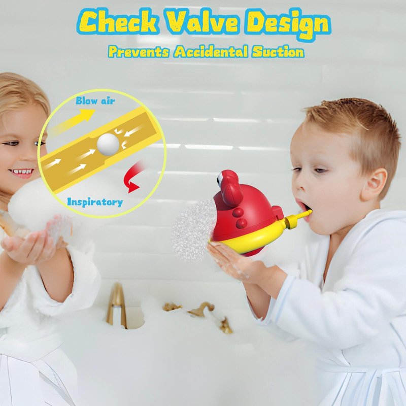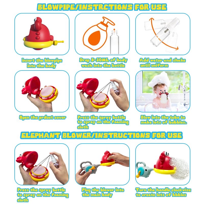 - 2 Modes Double the Fun - The bubble bath toy has two different modes, manual and mouth blowing dual mode. A sea of bubbles can be instantly achieved by adding bubble blowing water [1] to the toddler bath toy. We come with an elephant model blower that rotates and swings in both directions for easy blowing! In addition with a mouth blowing tube, direct blowing can produce "bubble train", let the child's bath more full of fun!
