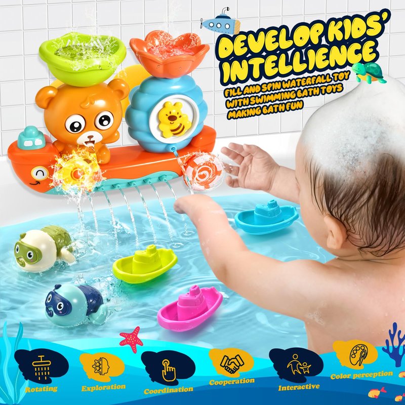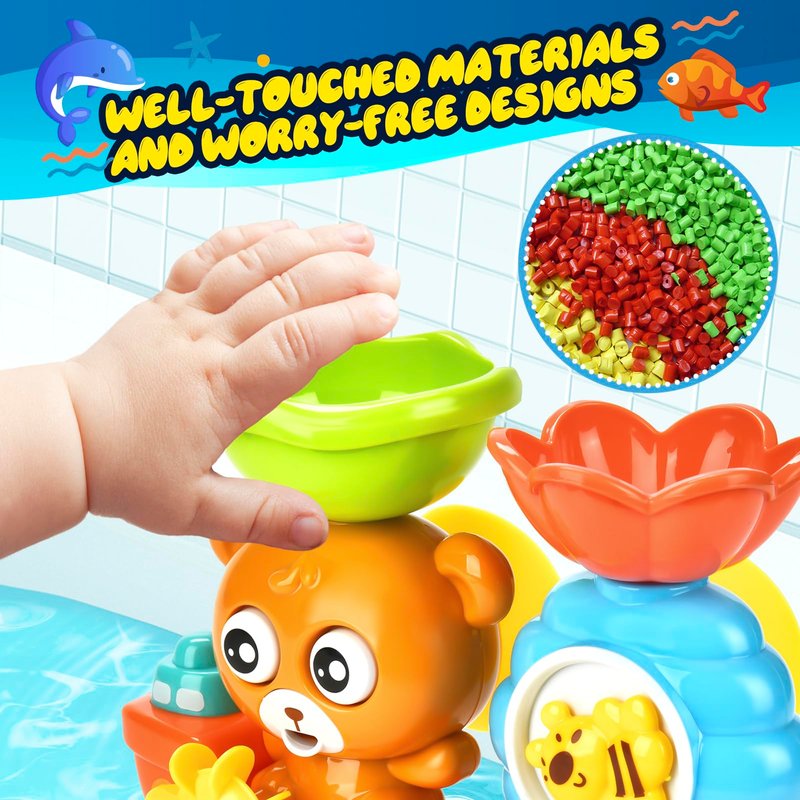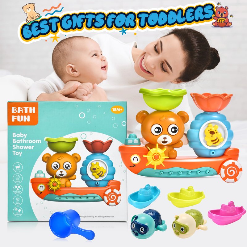 - 【Fill & Spin Bear Baby Bath Toys】From now on, this bath toy will make your baby fall in love with bathing. Interesting animals shape and colorful interesting boats, just use a spoon to pour water into the top of the bear, driven by the current, the eyes, rudder, bees and propeller will rotate, and then the water will flow out from the bottom to form a waterfall, It is very easy to attract the attention of the child and make the kids bathing happily.