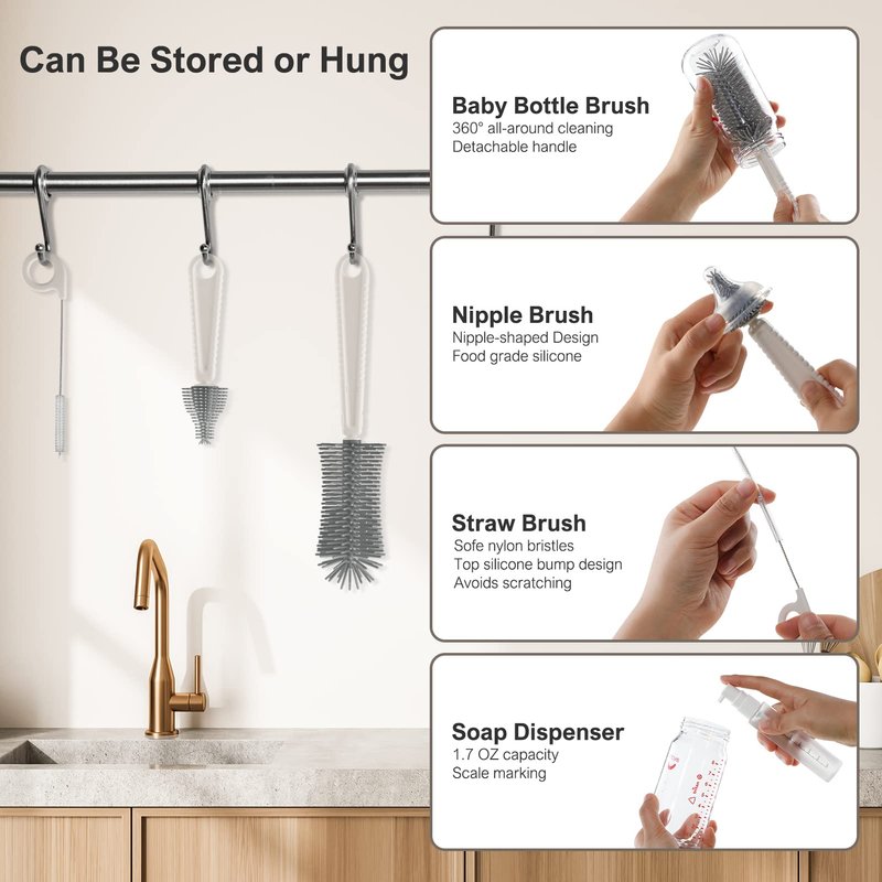 - 【6-IN-1 Baby Cleaner Set】Upgraded bottle brush set with an extendable bottle brush,nipple brush,straw brush,soap dispenser, bottle drying rack& storage box.Engineered to reach narrow openings and crannies for deeper cleaning without damaging interior surfaces, while 1.7oz soap dispenser easily dispenses soap for quick and easy cleaning
