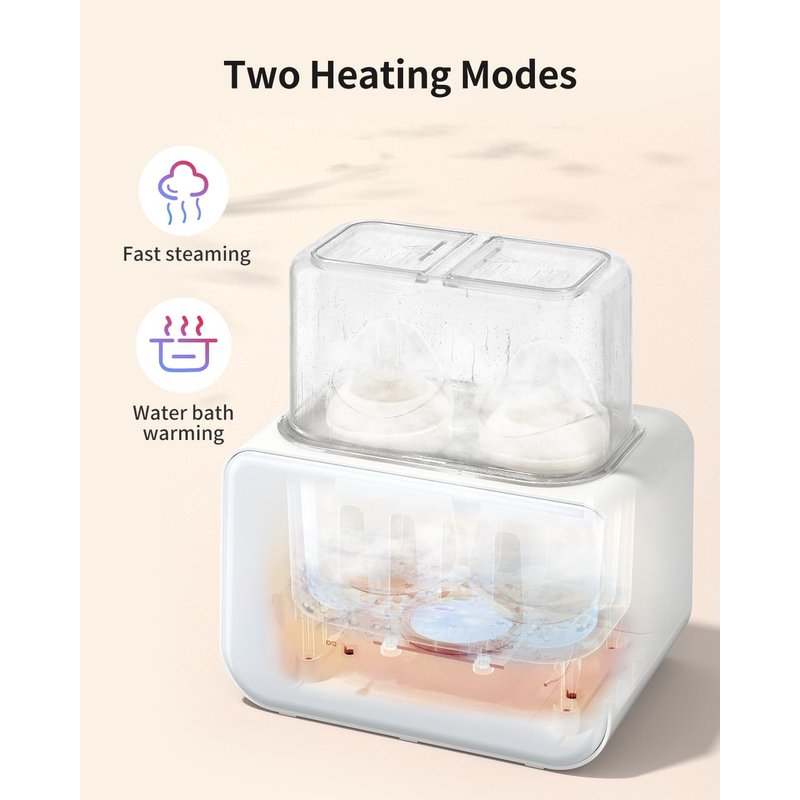 - 【Smart 10-in-1】Fast Steaming / Water Bath Warming/ Thaw / 24H Keep Warm / Sterilize/ Food Heating / Adjustable Timer / Adjustable Temp / Large capacity / Anti-scald Basket. This do-it-all twin bottle warmer is ideal for twin families. A double bottle warmer is enough to meet all your daily feeding needs and save space and budget.