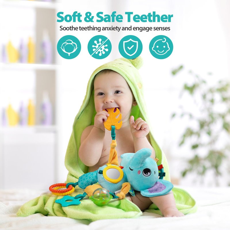 - Early Development Toy: Car seat toys, design with Teether Rattle,Bite Saving Buckle, and Tummy Time Sensory Toy Mirror. Dangle toys for babies, attract their attention and guide they to grasp in order to strenthen their waist force to sit up. Improving their hand-eye coordination