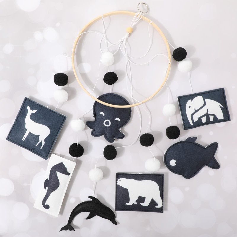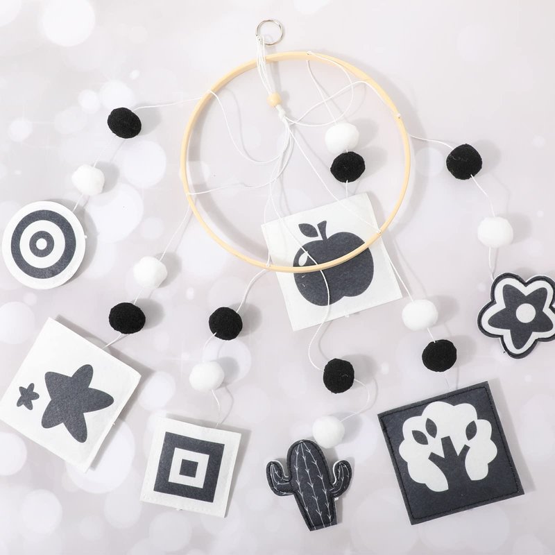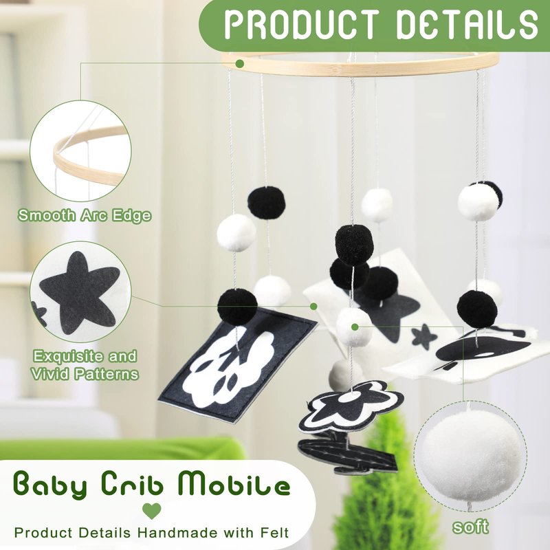 - Black and White Color Design: this felt crib mobile will be your baby's first visual stimulus, baby's eye develops quickly, but at first can only focus on high contrast objects, such as simple black and white shapes; The shape of the plush and the contrasting black and white colors reassures and relaxes the baby and gives him a sweet sleep