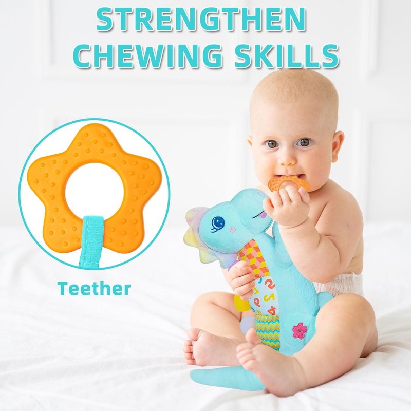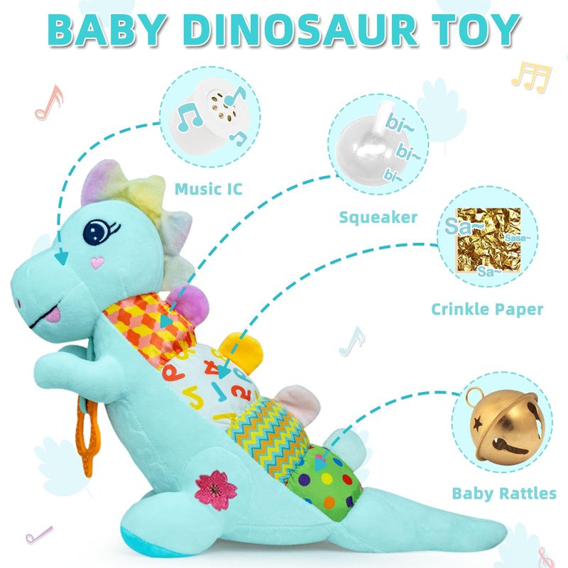 - 5 IN 1 BABY DINOSAUR TOY: Multi-Functional baby dinosaur plush toys combine the fun of crinkle sound paper,rattle, musical ic head, teether into this toy. Encourage tactile exploration for babies aged 0-6-12 months, let your baby experience different fun through cute dino toys.
