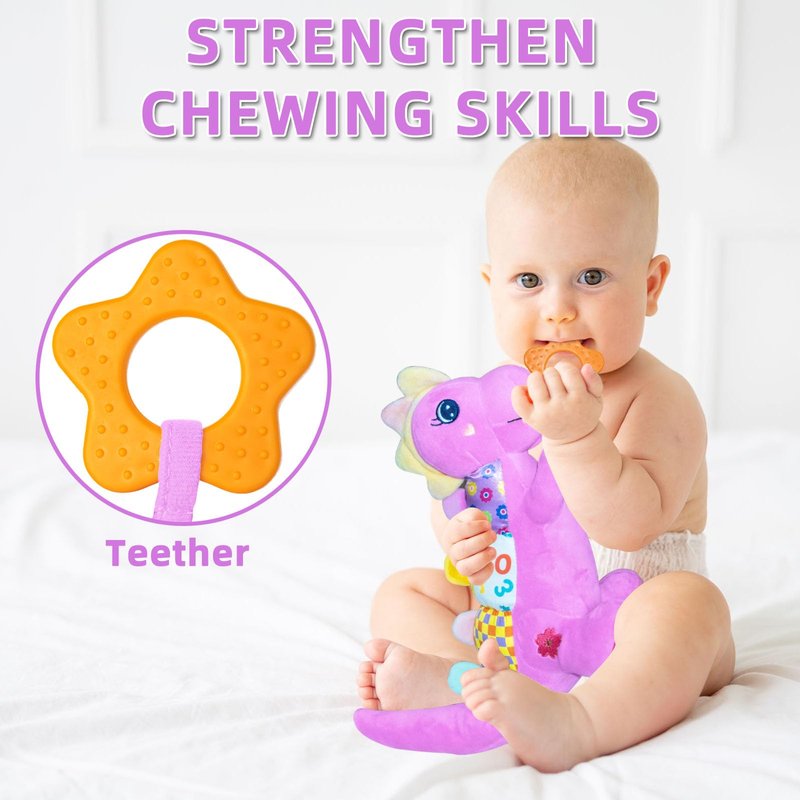 - 5 IN 1 BABY DINOSAUR TOY: Multi-Functional baby dinosaur plush toys combine the fun of crinkle sound paper,rattle, musical ic head, teether into this toy. Encourage tactile exploration for babies aged 0-6-12 months, let your baby experience different fun through cute dino toys.