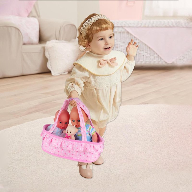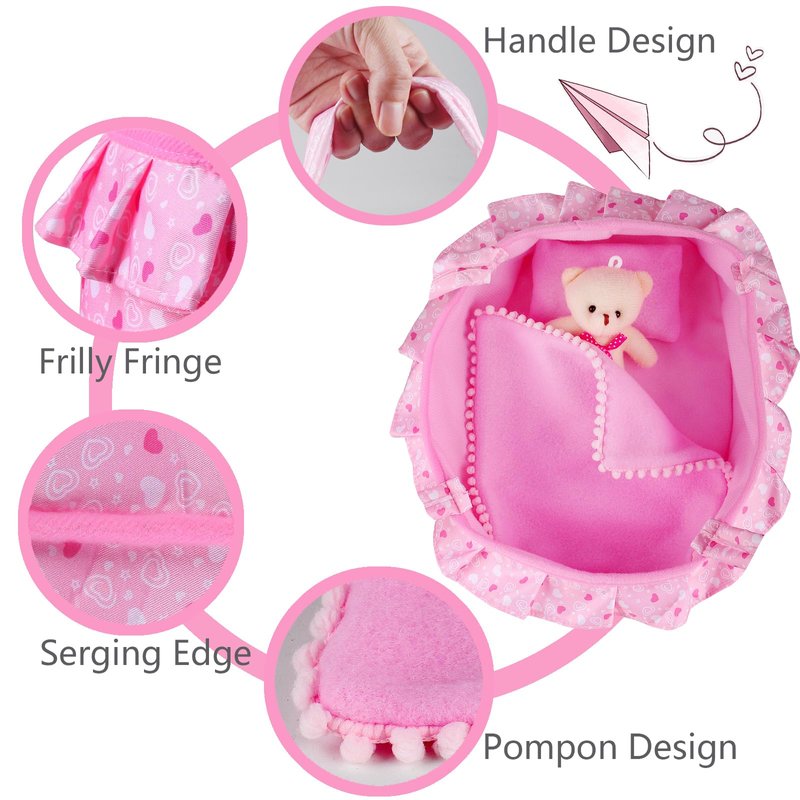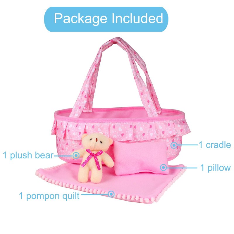 - Product Info : Includes 1 doll bassinet,1 pillow, 1 quilt,1 plush bear. Doll carry bag fits for dolls smaller than 12 inch.Cradle size:12'' X 7.5'' X 4''. Especially designed with thicker linings.Dolls are not included