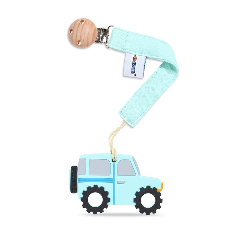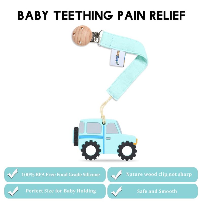 Baby Food Grade Silicone Teether Toy with Pacifier clip Holder,Teething Pain Relief Toys Gift Set for 3 Months+ Boys and Girls,Freezer Safe,BPA Free (Blue Car)