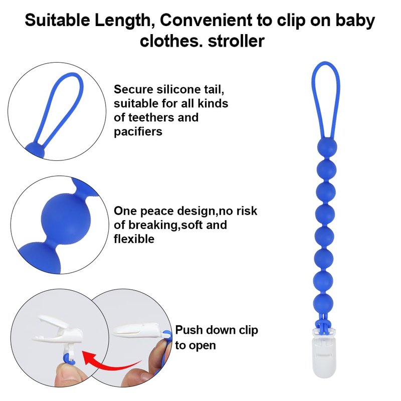 - Make Parents Easy: Our teethers are perfect size and easy-grasp design for baby to hold,Strong plastic clip can be clipped on baby clothes,blankets,toys,strollers,or car seats,the suitable length design prevents the baby's pacifier and teether toys from falling to the ground.