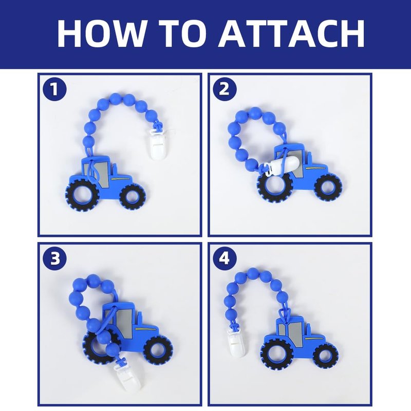 Baby Food Grade Silicone Tractor Truck Teether Toy with One Piece Design Pacifier Clip Holder,Teething Pain Relief Toys Gift Set for 3 Months+ Boys and Girls,Freezer Safe,BPA Free. (Blue)