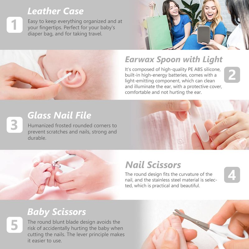 - 👶【UPGRADED 11-PIECE SET】Our baby grooming kit includes nail clippers, rounded safety scissors, glass nail file, nasal suction, baby brush, baby comb, baby feeder dropper, tweezers, finger toothbrush, Earwax spoon LED light(with 4 removable tool heads). Fully meet the baby's daily needs!