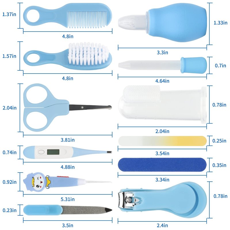 - 24-in-1 Baby Grooming Kit: The package comes with the baby grooming kit, including 7 x baby nail files, water temperature tester, newborn hairbrush, babies comb, finger toothbrush, tweezer, nasal aspirator, baby scissors, ear Cleaner, medicine dropper, portable blue EVA bag, alcohol prep pads, etc. This 24-in-1 grooming kit can be used for our newborn baby's daily needs