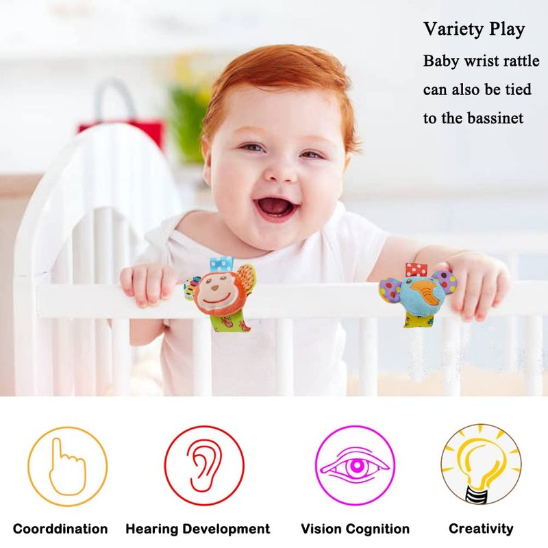 - EARLY DEVELOPMENT : These wrist rattles for babies will make a soft sound when shaking, that will help your baby to develop hearing training.The vibrant color and cute animals will attract newborns to touch and watch them, that will help baby to strengthen motor skills,eyes-hands coordination,color cognition, vision cognition, and promote hearing development and voice development.