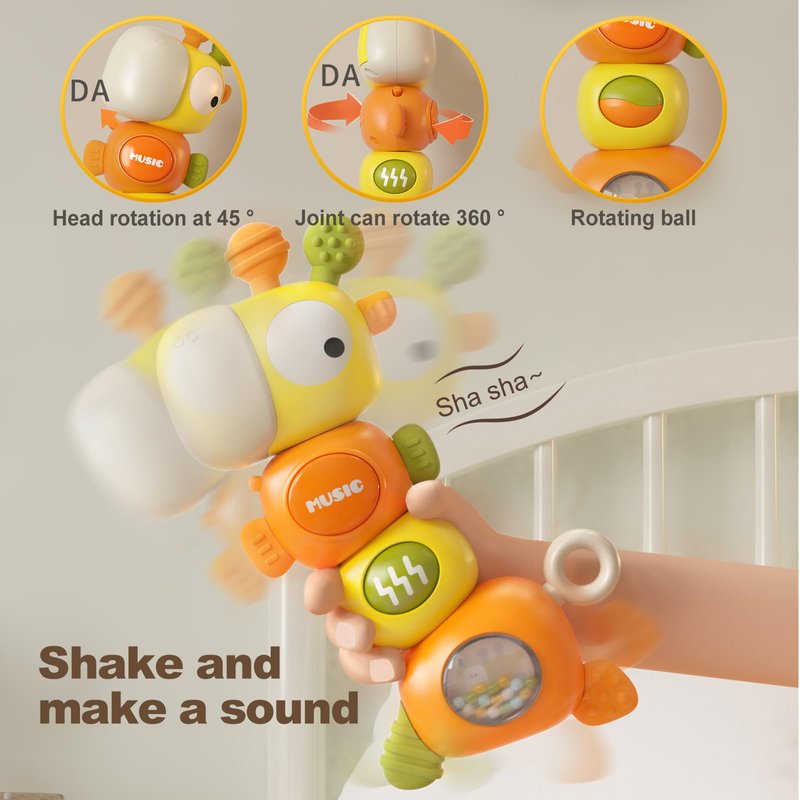 - Interactive Sensory Experience: Features four rotating layers, each making a clicking sound. Shaking the rattle produces crisp sounds, and pressing the button switches between different musical tunes, enhancing sensory exploration.