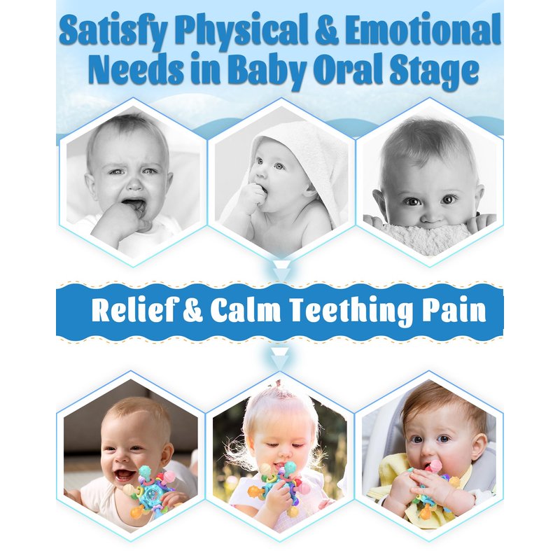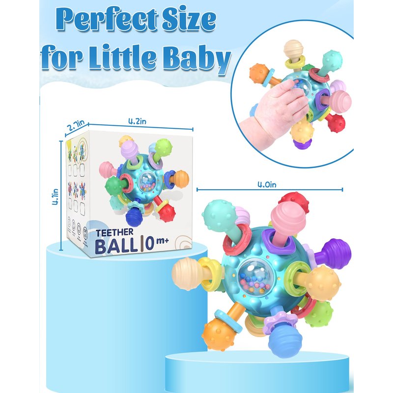 - Baby Multi-Sensory Teething Toys: Tonberless hand-held baby teething toys, the baby will have the habit of biting or crying, eating hands. The 360-degree rotary teething ball has 12 chew points and different textured surfaces. Massage the gums to relieve teething pain more effectively and meet the needs of the baby's oral stage. Different textures provide a stimulating touch and help the baby's sensory development.