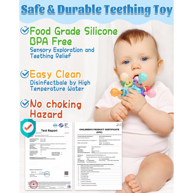 - Safe & High Quality: Our hand-held baby teething toys are made of food-grade grindable silicone and ABS, certified by ASTM and CPC, are BPA-free, non-toxic, do not have any sharp edges, and protect your baby's lips and gums. They are small enough to fit a baby's mouth, with soft balls at the tips, and are soft enough to chew without choking or hurting the back of the throat.