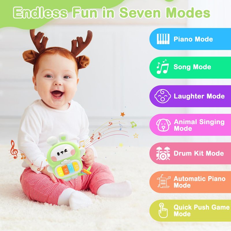 - Endless Fun in Multi Modes: Rabbit music baby toys for 1 year old boy girl have multi modes to play. Our baby musical bunny toy has four musical buttons and a white mode switching button, including piano mode, Song Mode (over 70 melodies), laughter mode, animal singing mode, Drum Kit Mode, Automatic piano Mode, and Quick push game Mode. The rich play content will surely attract your baby