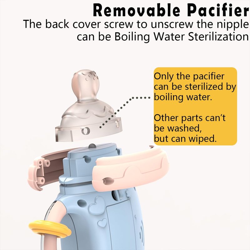 - Easy to Clean & Use: The pacifier is detachable and machine washable. With 1pc musical cartoon machine and 3pcs pacifiers for exchange. (Without batteries in the package, it supports 2 x AAA batteries)