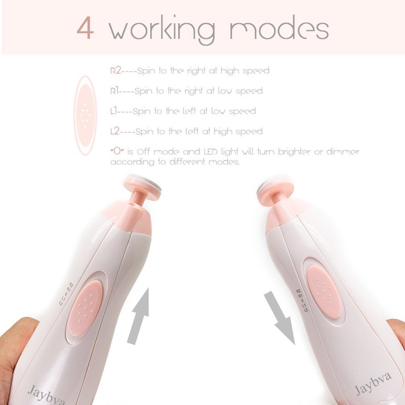 - SELECTABLE FILE SPEED AND SINGLE HAND OPERATED . This baby nail file can choose high low speed and clockwise reverse spin direction . Single hand operated . You won't have to worry about trim the right hand nails by left hand .