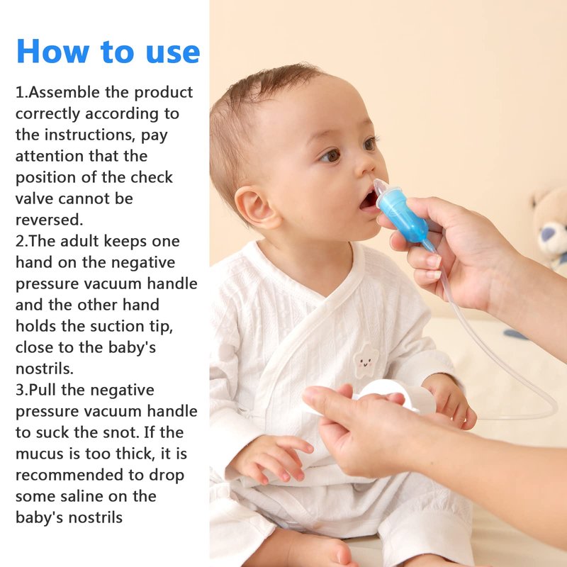 - 😊How to use 😊: Place the nozzle of the nasal aspirator into the baby's nostrils, making sure it is placed where the baby's nostrils have snot, and keep adjusting the position of the nozzle while the adult extracts it with force. The baby's nasal snot will eventually be sucked out.