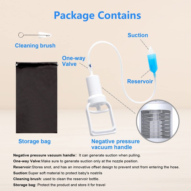 - 😊Hygienic and Quiet 😊 -portable hand puller nasal aspirator save parents from germs .It makes no noise and can be used while the baby is sleeping.And the anti-reverse flow design is adopted, and the snot in the liquid storage bottle will not flow back out. Most importantly, it doesn't require disposable hygiene filters which makes it cost-effective.