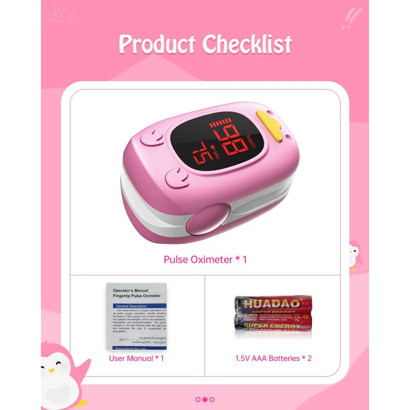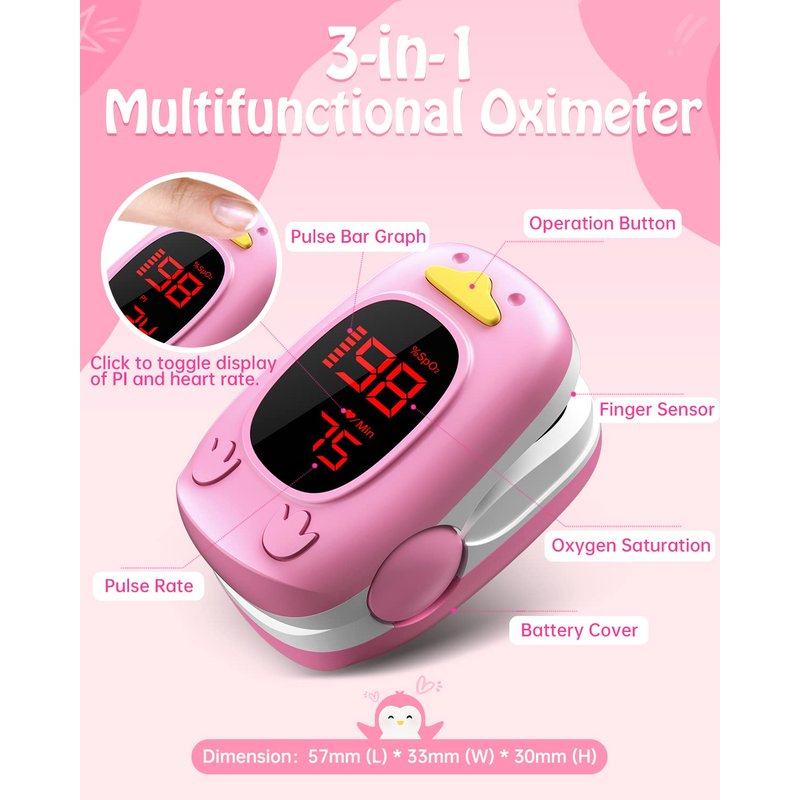 Children Pulse Oximeter for Kids Baby Item Weight:34g Product Dimensions:8.8CMX7CM*4CM Batteries Requied: 2*AAA Batteries( Color: Pink Include: Baby Pulse Oximeter Fingertip*1, AAA Batteries*2, User’s Manual*1
