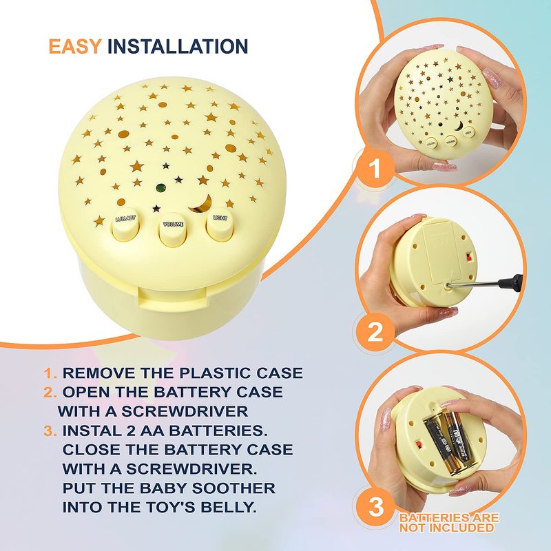 - Soother toy - take out the plastic part, insert 2 AA Batteries, close the battery compartment, switch on the tumbler and insert baby soother sound machine into the soft toy.