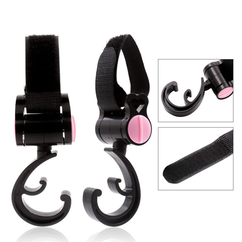 - Black Stroller Hooks made of ABS material for excellent durability and toughness.Sticker length: 14 cm, suitable for any putter less than 5.5 cm in diameter.Rotation allows 360 degree rotation, super convenient.